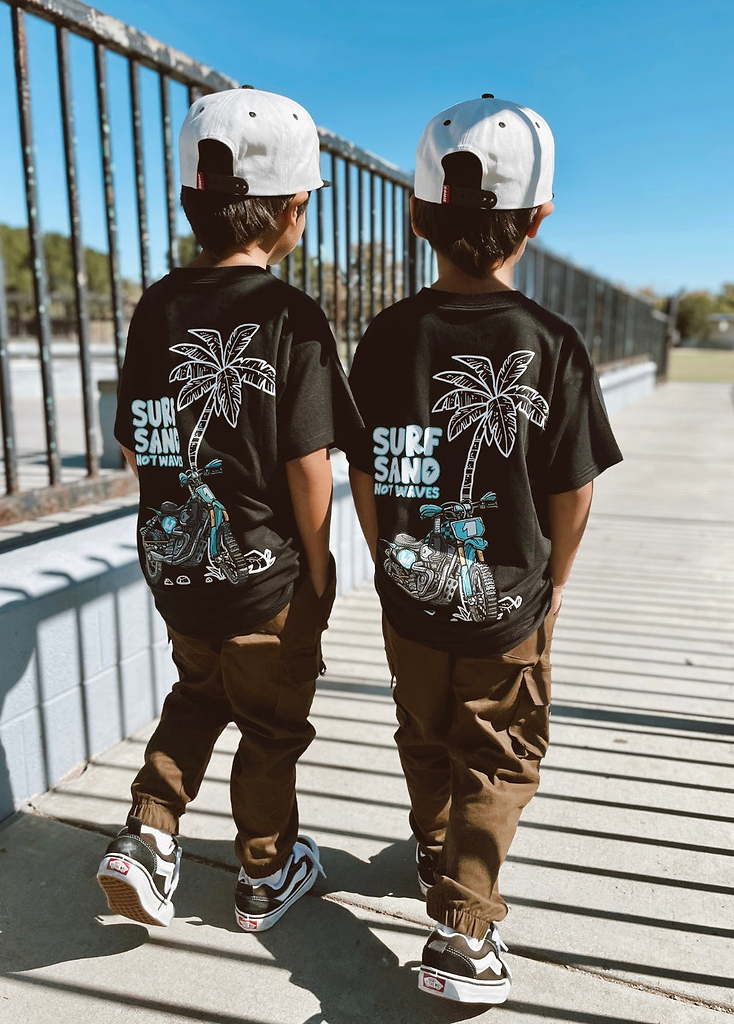 Little Trouble was inspired by my sons Cash & Axle and kids like them. We’re celebrating kids for being kids. For being carefree and wide-eyed. For running into the freezing cold ocean (and loving it). For fearlessly riding their mini dirt bikes. For falling off their skateboards and rocking a purple band-aid. For being authentically themselves. For being kind. For being world changers.