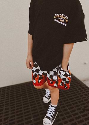 White mesh, black flames, checkerboard fill — made to thrash or chill.