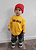 Orange t-shirt with 'Fast Makes Me Happy' text, black cap, white shorts with black flame design, and black and white sneakers on a gray surface.