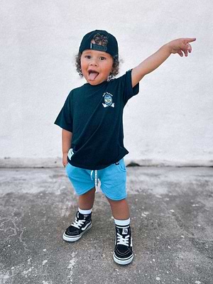 A classic, now available for your kids only at Little Trouble Cool, crisp and classic. Little Trouble is known for our fit, quality and material and when you add the unmistakable WCC Iron Cross with its Long Beach roots to it...it's a closet...