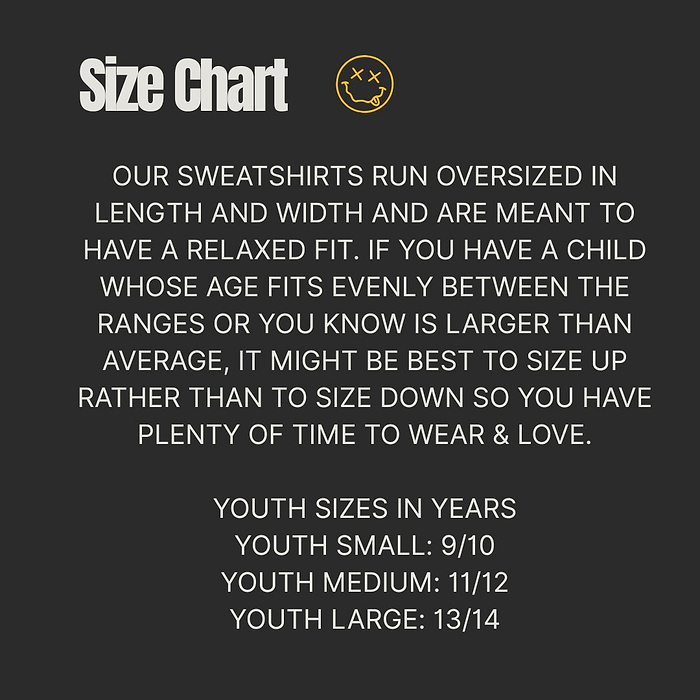 Available in three different graphic colors, yellow/white (pictured) blue/pink, and teal/pink, each sweatshirt has a two-tone thunderbolt on the right forearm and our classic smiley face on the back. I mean...could this get better?